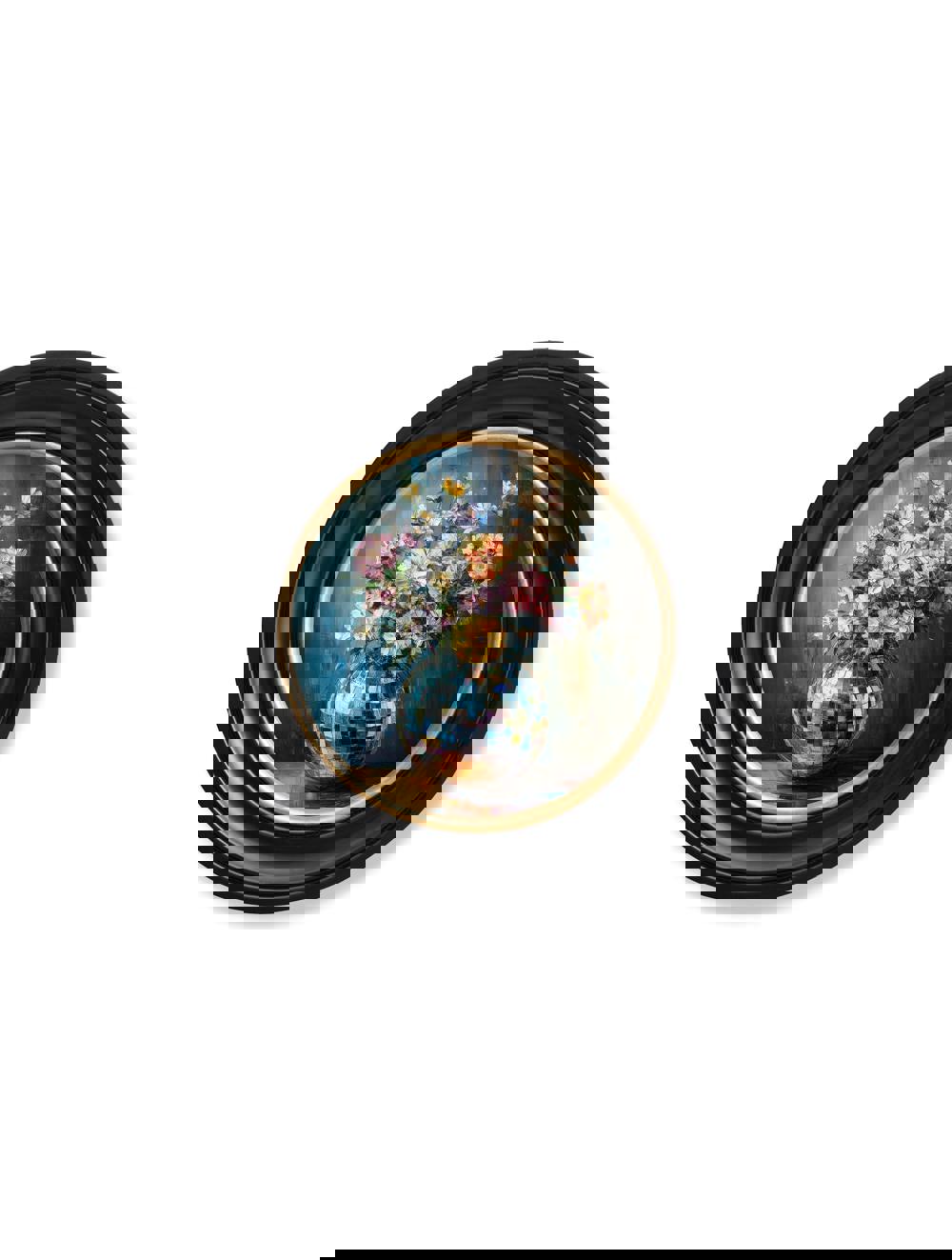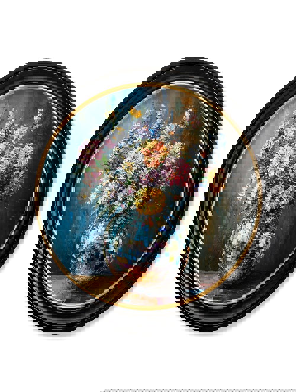This joyful print features a vibrant wildflower bouquet bursting from a shimmering mirrored disco-ball, blending floral elegance with a playful, modern twist. Expressive palette-knife textures and brushstrokes bring each petal to life, while the mosaic reflections of the disco-ball vase add movement, light and a subtle touch of glamour. The moody blues in the background balance the soft pinks, whites and sunny yellows of the flowers, creating a fresh yet cosy focal point for any space. Finished in our signature round Oxford Black and Gold frame, this print pairs beautifully with our Disco Bloom collection, adding colour, texture and a hint of sparkle to any room.