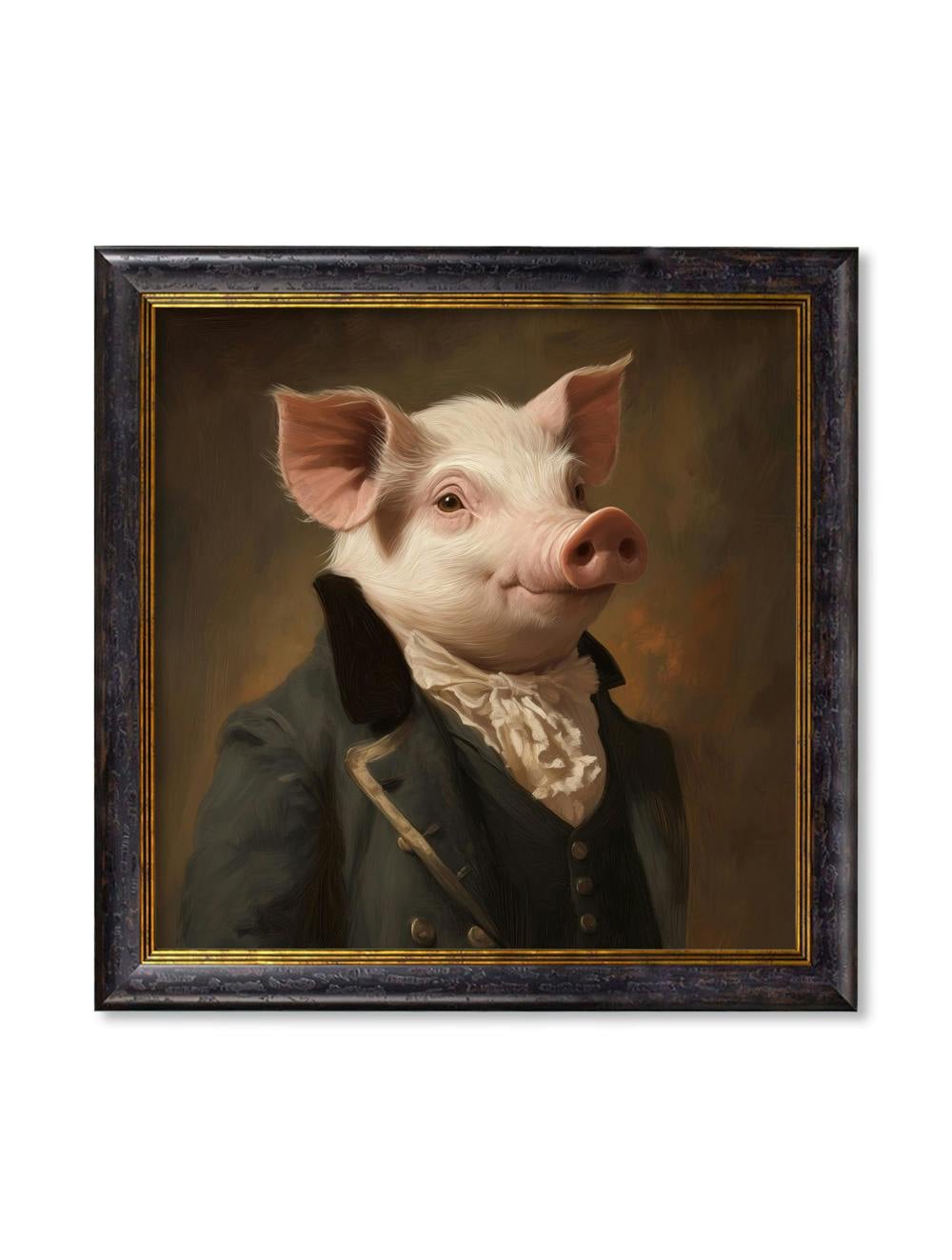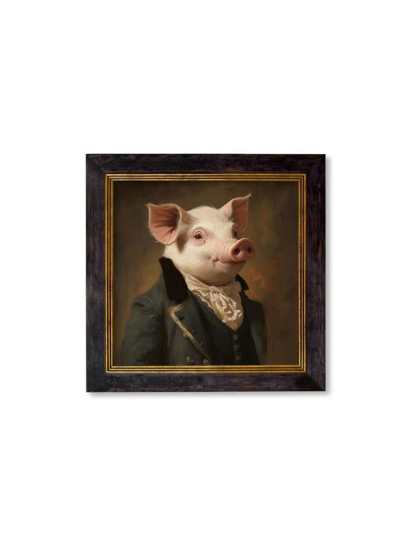 The Exceptional Art Duke of Truffleton presents a farmyard pig with elegance and personality, dressed in a dark jacket and waistcoat. Set within a square Oxford Black and Gold frame, this characterful piece is designed to bring a distinctive focal point to your interior, whether styled in a hallway, living space or study.