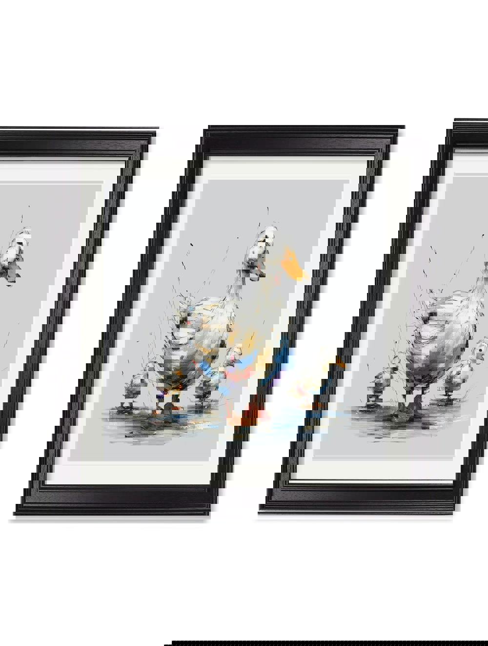 This delightful print brings a touch of warmth and whimsy to your walls, featuring a Family of Ducks captured in a playful, expressive style. Full of character, the design showcases fine sketch and brushstroke details that highlight their cute expressions and charming personalities. The soft, textured tones create a cosy, heartwarming focal point that brightens any space. Set against a pale grey background and finished in our square Black Hurstwood frame with mount, this print stands beautifully on its own or as part of our animal cosy sketch collection.
