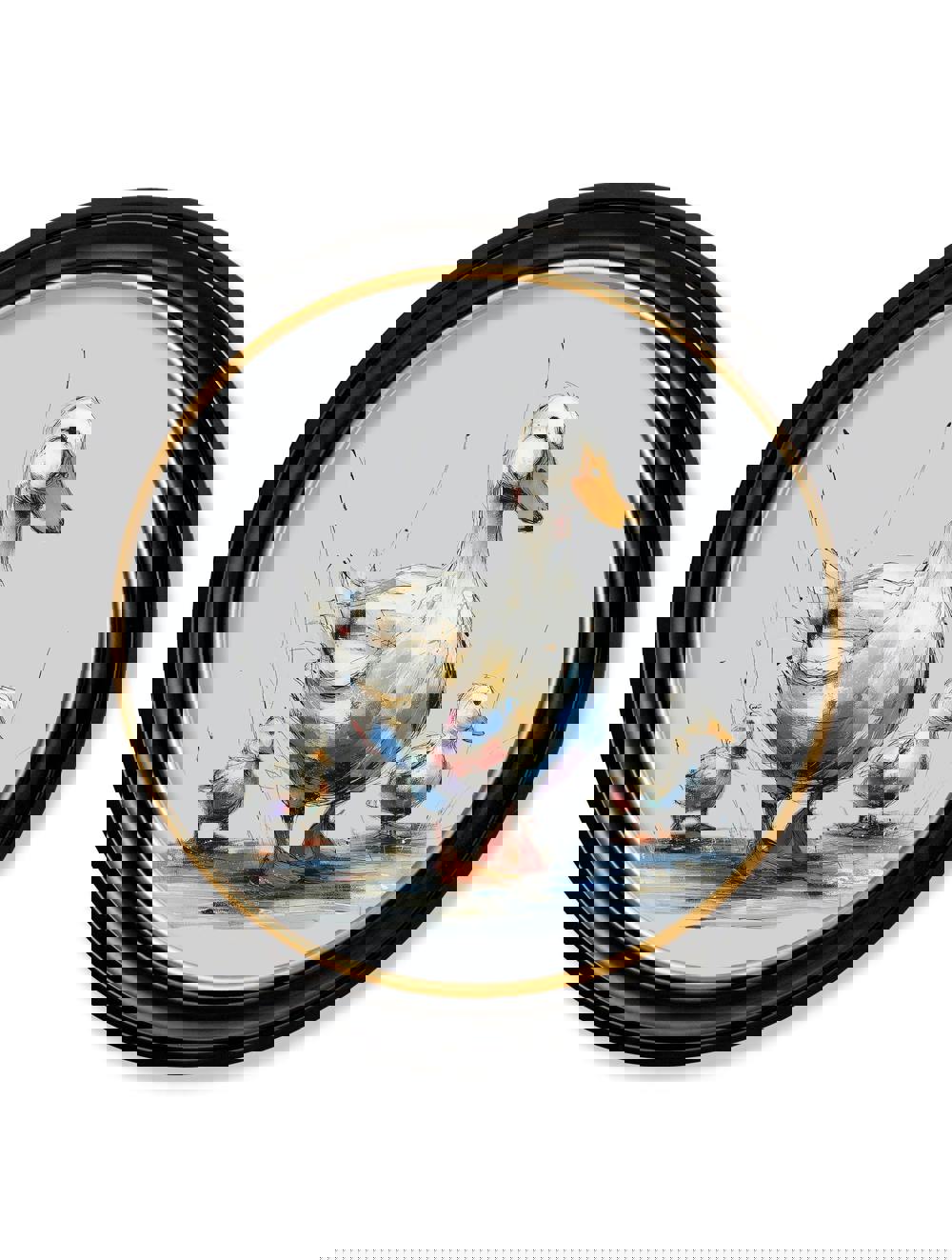 This delightful print brings a touch of warmth and whimsy to your walls, featuring a Family of Ducks captured in a playful, expressive style. Full of character, the design showcases fine sketch and brushstroke details that highlight their cute expressions and charming personalities. The soft, textured tones create a cosy, heartwarming focal point that brightens any space. Set against a pale grey background and finished in our signature round Oxford Black and Gold frame, this print stands beautifully on its own or as part of our animal cosy sketch collection.
