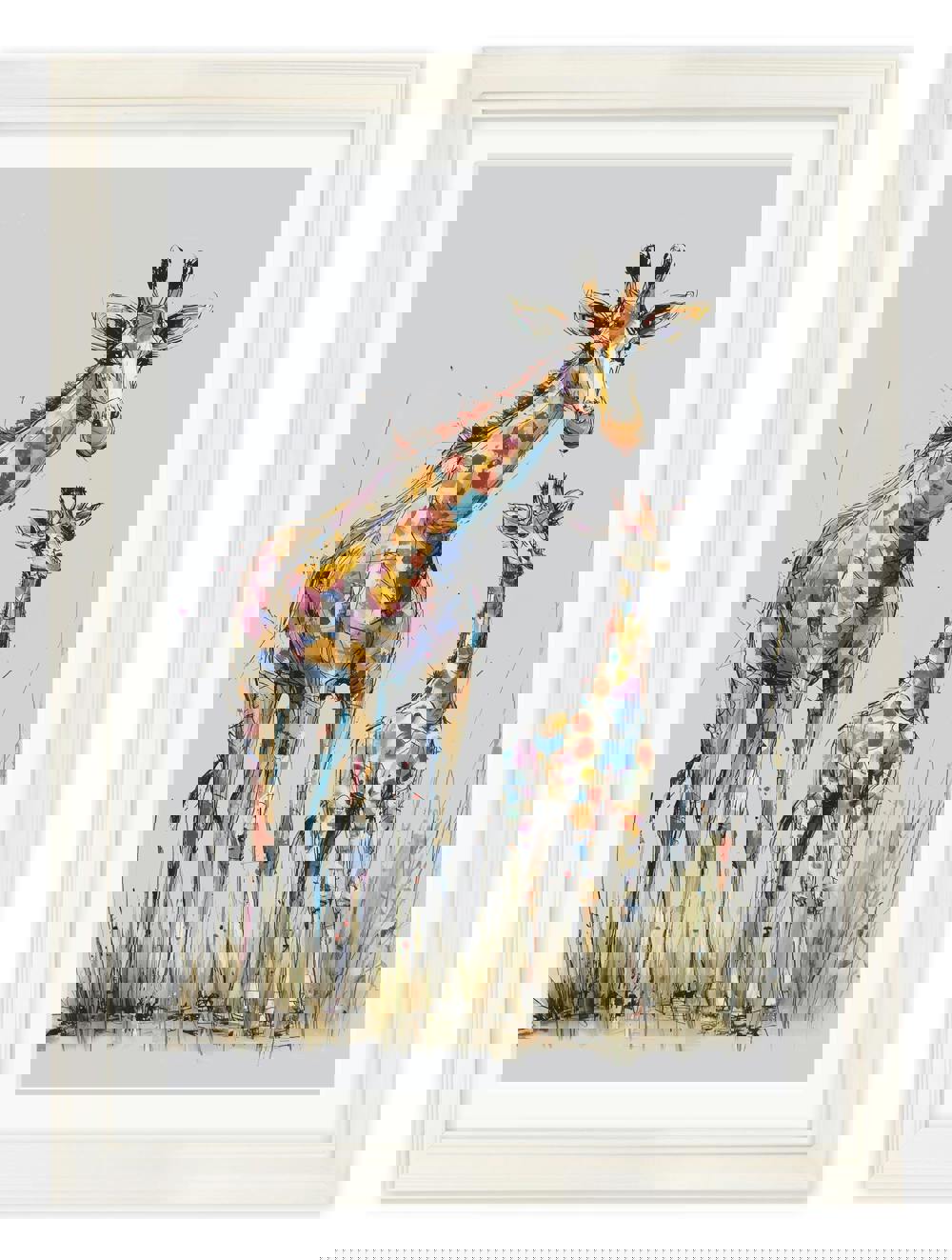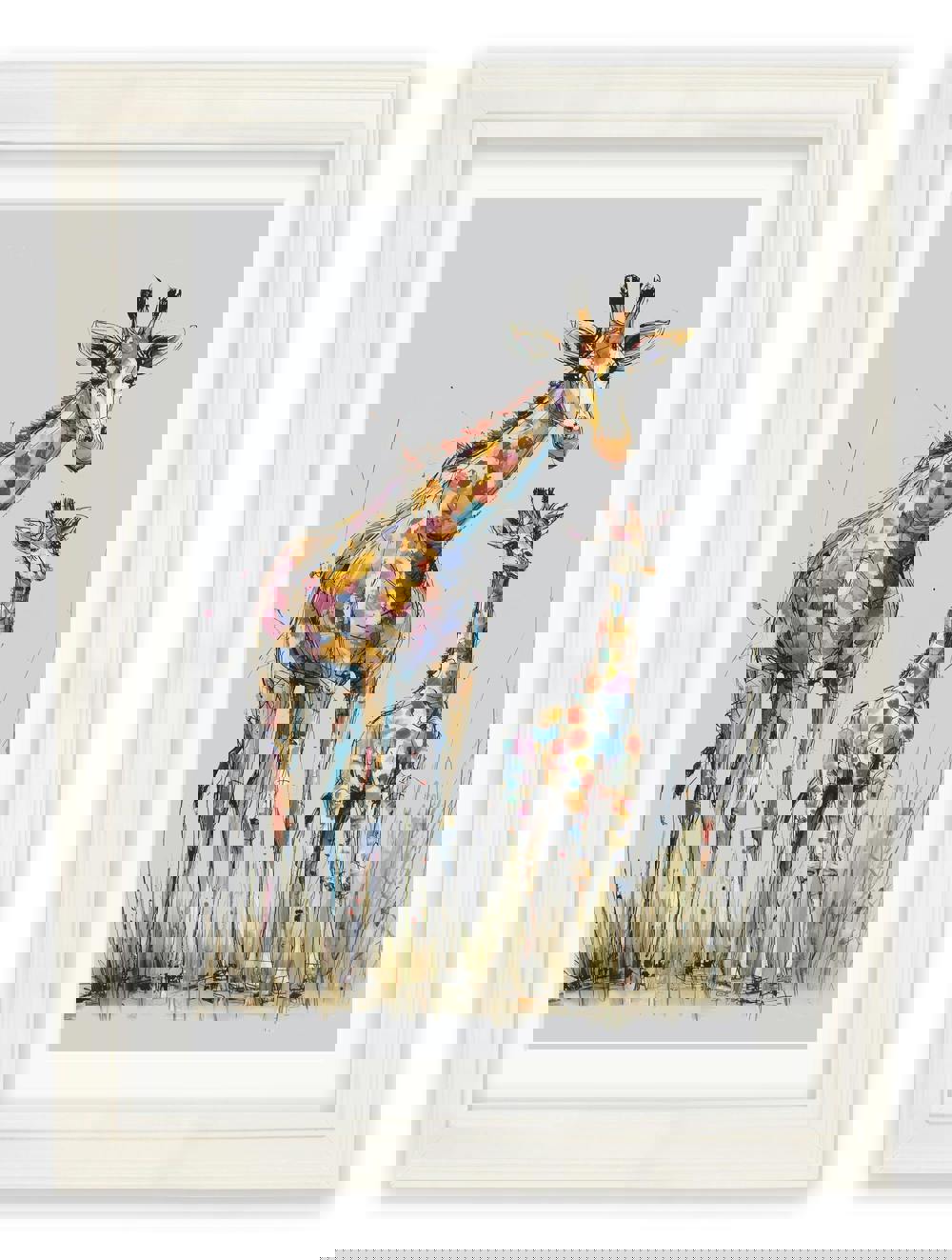 This sweet Family of Giraffes print brings warmth and charm to any room, featuring a loving mummy and baby giraffe captured in a playful sketch style. Full of personality, the fun brushstrokes highlight their curious expressions, gentle nature and family bond. Set against a soft faded grey background and finished in our signature Cream Hurstwood frame with mount, it makes a lovely standalone piece or a heartwarming addition to our animal cosy sketch collection.