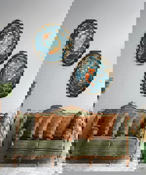 Finished in a round Oxford Black and Gold frame, it arrives ready to hang. It also looks beautiful displayed alongside its pair, Japanese Koi Carps Dusk.