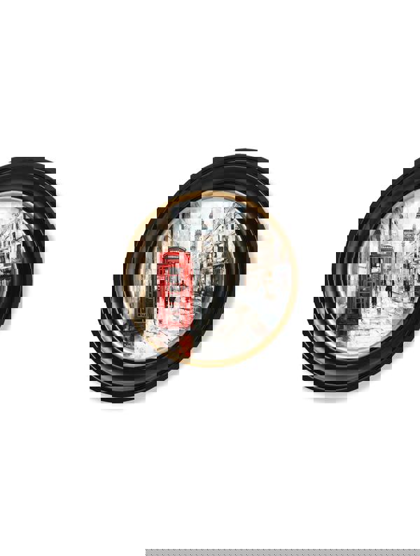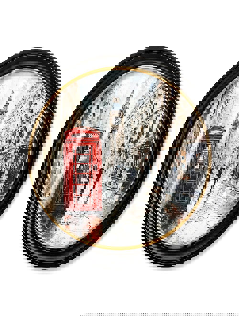 This captivating oil-paint style print celebrates one of London’s most beloved icons — the classic red telephone box, standing amid the city’s moody, rain-swept streets. Glossy pavements mirror the soft glow of London streets, while misty architecture fades into the background, capturing the quiet magic of the capital. The contrast of soft greys and urban shadows with that unmistakable flash of red gives a refined yet lively presence. Presented in our round Oxford Black and Gold frame, this piece offers an elegant tribute to London’s heritage.