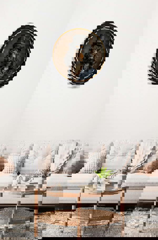 Lord Longears is a Cocker Spaniel who embodies timeless charm and distinguished character. Dressed in a navy blue jacket, beige waistcoat and a classic black top hat. He sits proudly against a muddy brown background in our Oxford Black and Gold frame.