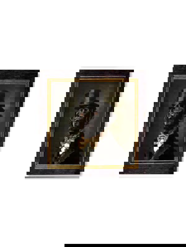 Exceptional Art Lord Wagsalot captures a dignified Black Labrador Retriever with a refined sense of character. Styled in a classic black waistcoat and jacket, with a black top hat and bowtie, Lord Wagsalot sits proudly within the Oxford Black and Gold square frame, creating a striking piece for considered interiors.