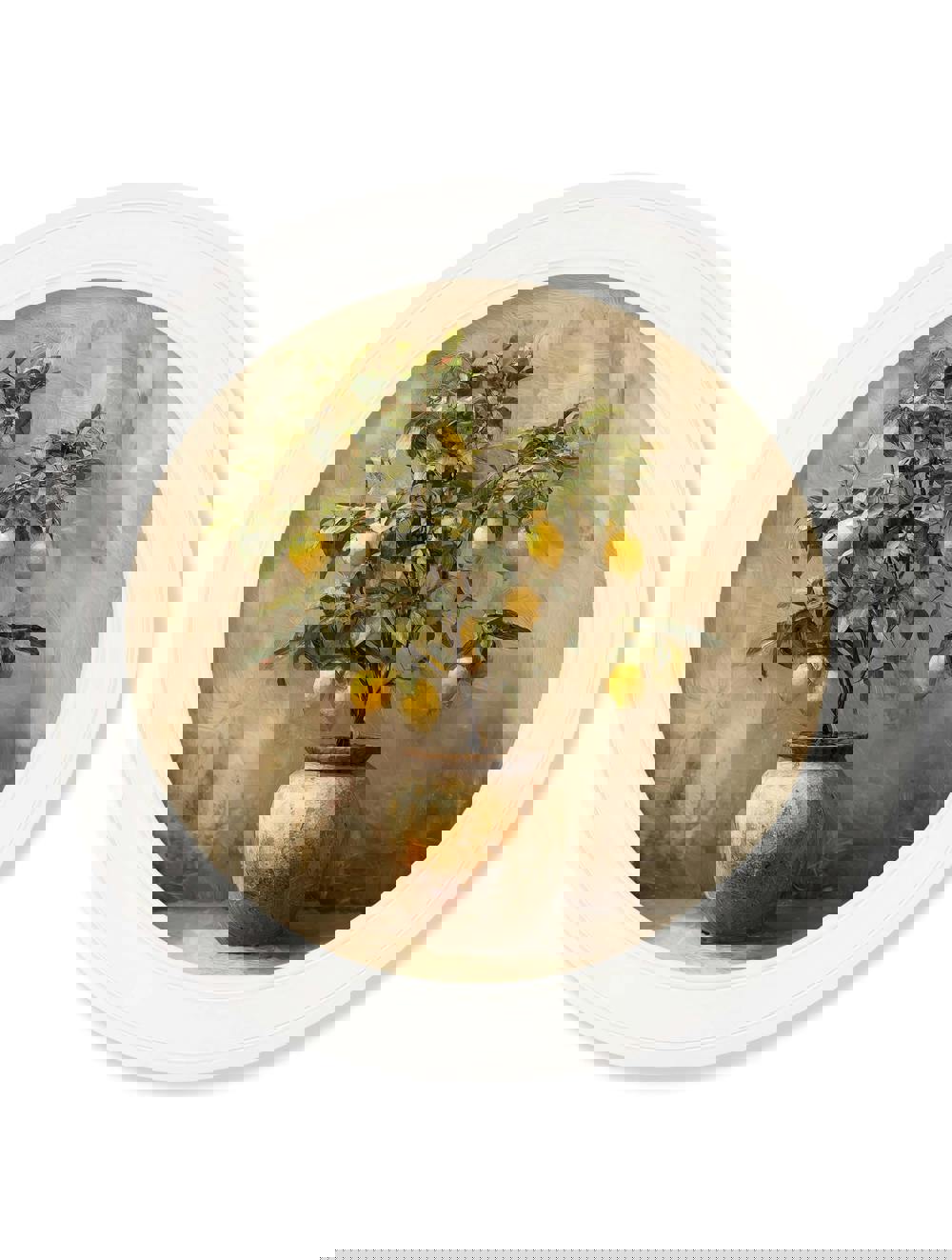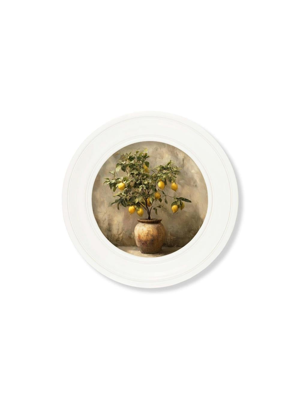 This uplifting print showcases a lemon tree heavy with sun-ripened fruit, nestled in a rustic pot. The warm yellows of the fruit glow against muted sage greens and soft stone neutrals, bringing a fresh yet calming Mediterranean charm to your space. Layered brushstrokes add depth and texture, giving the artwork a natural, organic feel. Finished in our signature round Oxford Strong White frame, this print adds a touch of natural warmth to any room.