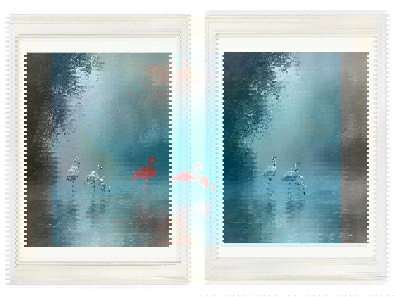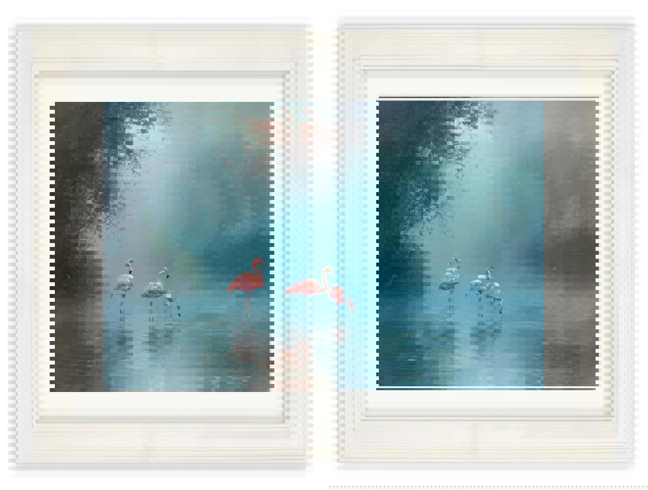 This elegant nature print showcases three graceful flamingos standing quietly in a tranquil, mist-covered lake. Soft teal and blue tones create a calm, atmospheric setting, while the gentle blush pink of the birds adds warmth and a beautiful focal point within the scene. Subtle texture and layered colour bring depth to the water and surrounding foliage, giving the print a peaceful, immersive quality. Set against a soft backdrop and finished in our Cream Hurstwood frame with mount, this print works beautifully as a standalone or paired with prints from our Misty Lake collection.