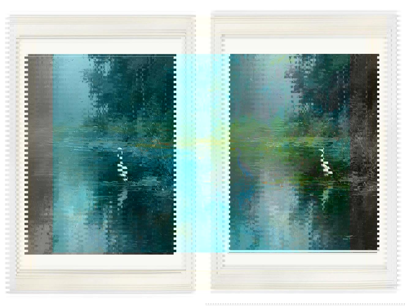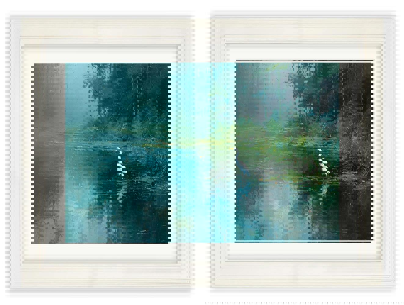 This elegant nature print features a graceful great white egret standing quietly at the edge of a still, reflective lake. Rich teal and deep green tones create a calm, atmospheric setting, while the bright white of the bird draws the eye and adds a striking focal point within the scene. Subtle texture and layered colour bring depth to the water and surrounding foliage, giving the print a peaceful, immersive quality. Finished in our Cream Hurstwood frame with mount, this print works beautifully as a standalone or paired with prints from our Misty Lake collection.