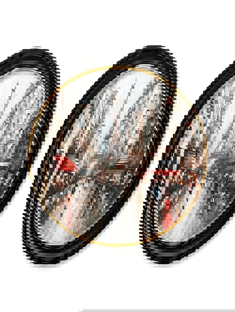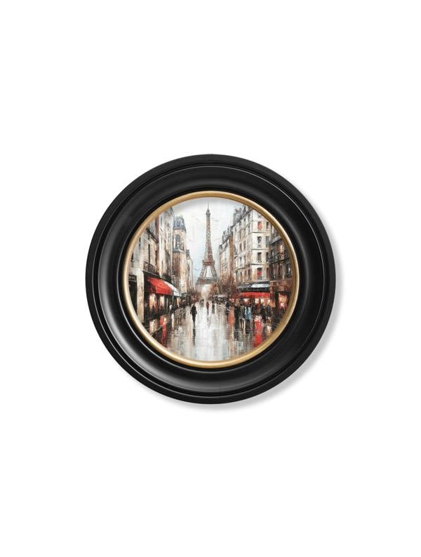 This elegant oil-paint style print captures a Paris street. Stone streets glisten under a soft, golden light, while chic café façades line the sidewalks. In the distance, the iconic silhouette of the Eiffel Tower rises gracefully. A blend of soft pastels with gentle shadows evoke the romance of the city, creating a snapshot that feels both lively and refined. Finished in our round Oxford Black and Gold frame, this print celebrates the charm of Paris.