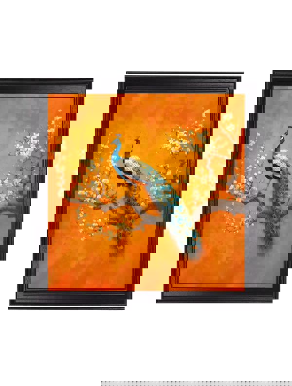 These striking prints feature a majestic peacock, full of elegance, perched gracefully among delicate blossoming branches. Rich teal and emerald feathers cascade beautifully against the warm saffron background, while the soft ivory blossoms add a gentle contrast. Set within our square Black Hurstwood frames, these prints have a luxurious, decorative feel that instantly draws the eye. They work beautifully as a standalone or paired with its companion.