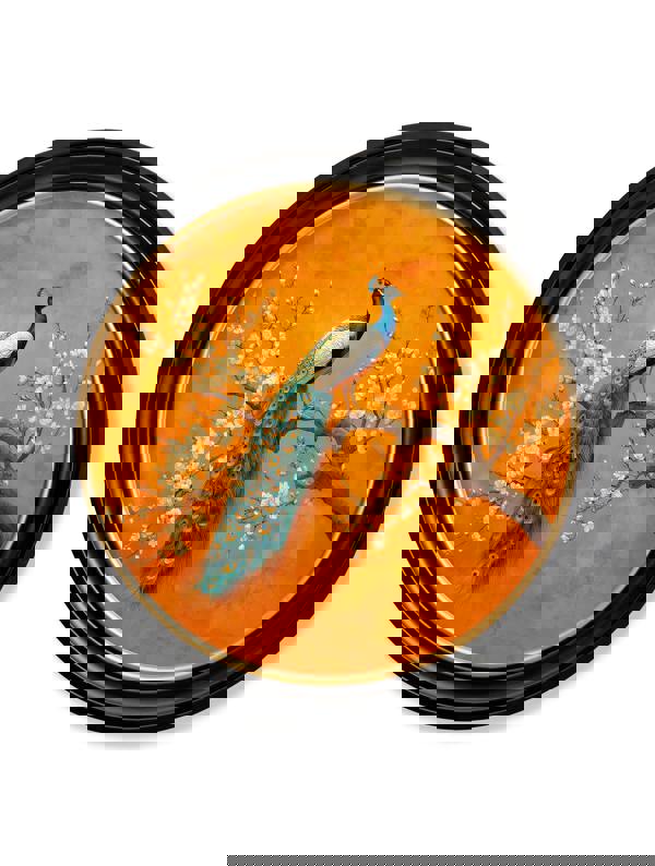 These striking prints feature a majestic peacock, full of elegance, perched gracefully among delicate blossoming branches. Rich teal and emerald feathers cascade beautifully against the warm saffron background, while the soft ivory blossoms add a gentle contrast. Set within our round Oxford Black and Gold frame, the artwork has a luxurious, decorative feel that instantly draws the eye. It works beautifully as a standalone or paired with its companion.
