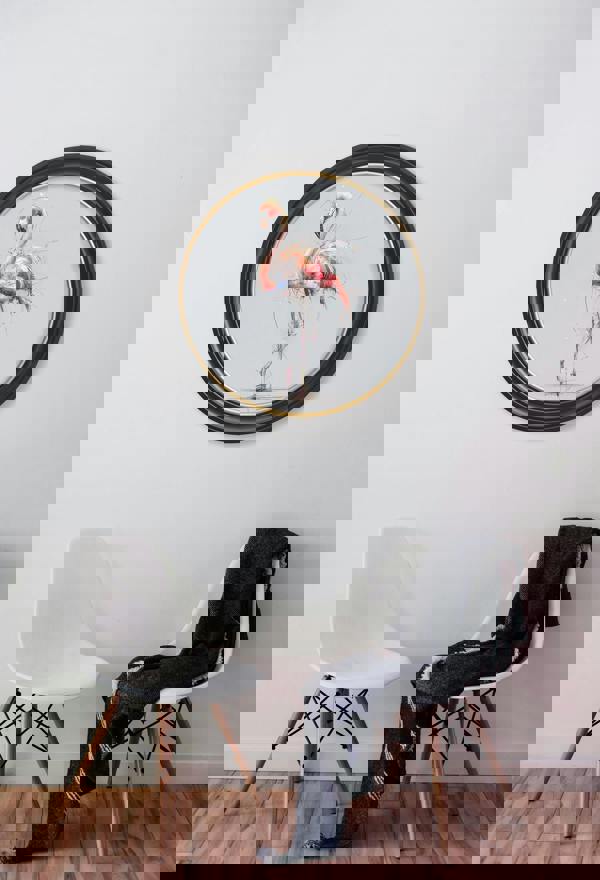 Bring a characterful accent to your interior with the Exceptional Art Pink Flamingo Cosy Sketch print. Featuring a graceful pink flamingo captured in a playful, sketchy brushstroke style, this piece pairs soft, warm tones with a gentle pose for an inviting finish. Set against a pale grey background and presented in a signature round Oxford Black and Gold frame, it works beautifully as a standalone artwork or as part of the animal cosy sketch collection.