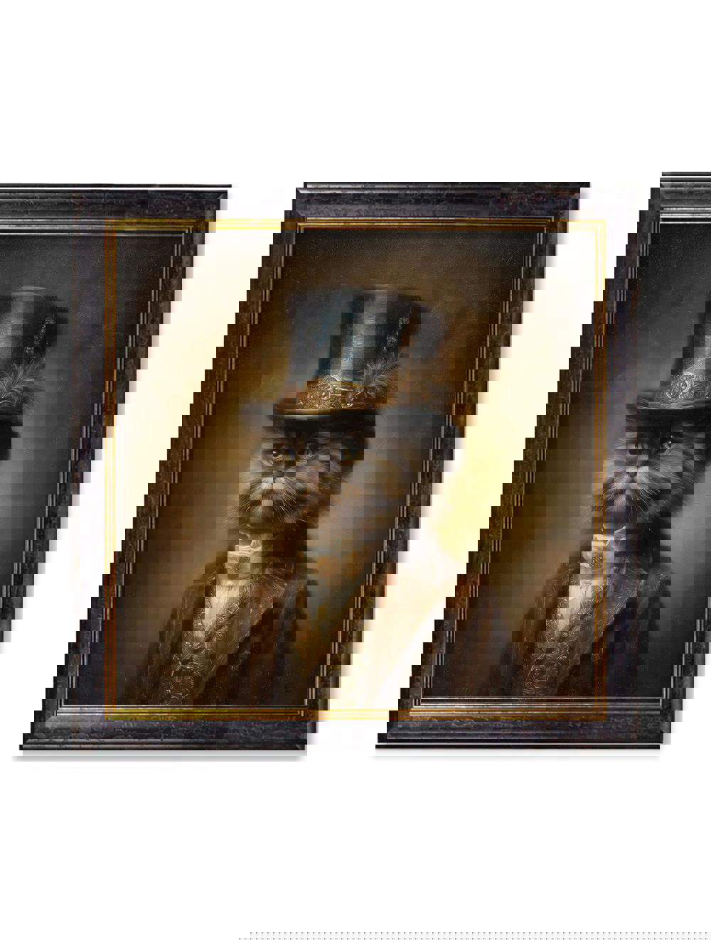 Exceptional Art Sir Fluffington captures a Persian cat with a flair for the fabulous, dressed in a tailored brown jacket and lustrous gold waistcoat. Finished with a black top hat sparkling with gold jewels and a feather, Sir Fluffington sits proudly against a rich brown backdrop, presented in a square Oxford Black and Gold frame.