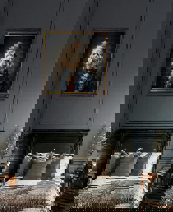 Exceptional Art Sir Wooliam captures an Old English Sheepdog with a poised, noble presence. Styled in a tailored blue jacket with a patterned dark amber waistcoat and a white cravat, the portrait is finished with a blue bow tie and beige hat. Set against a deep brown backdrop, it is beautifully presented in a square Oxford Black and Gold frame, bringing a refined focal point to hallways, living spaces or studies.