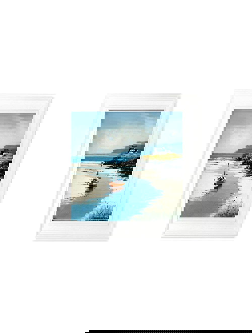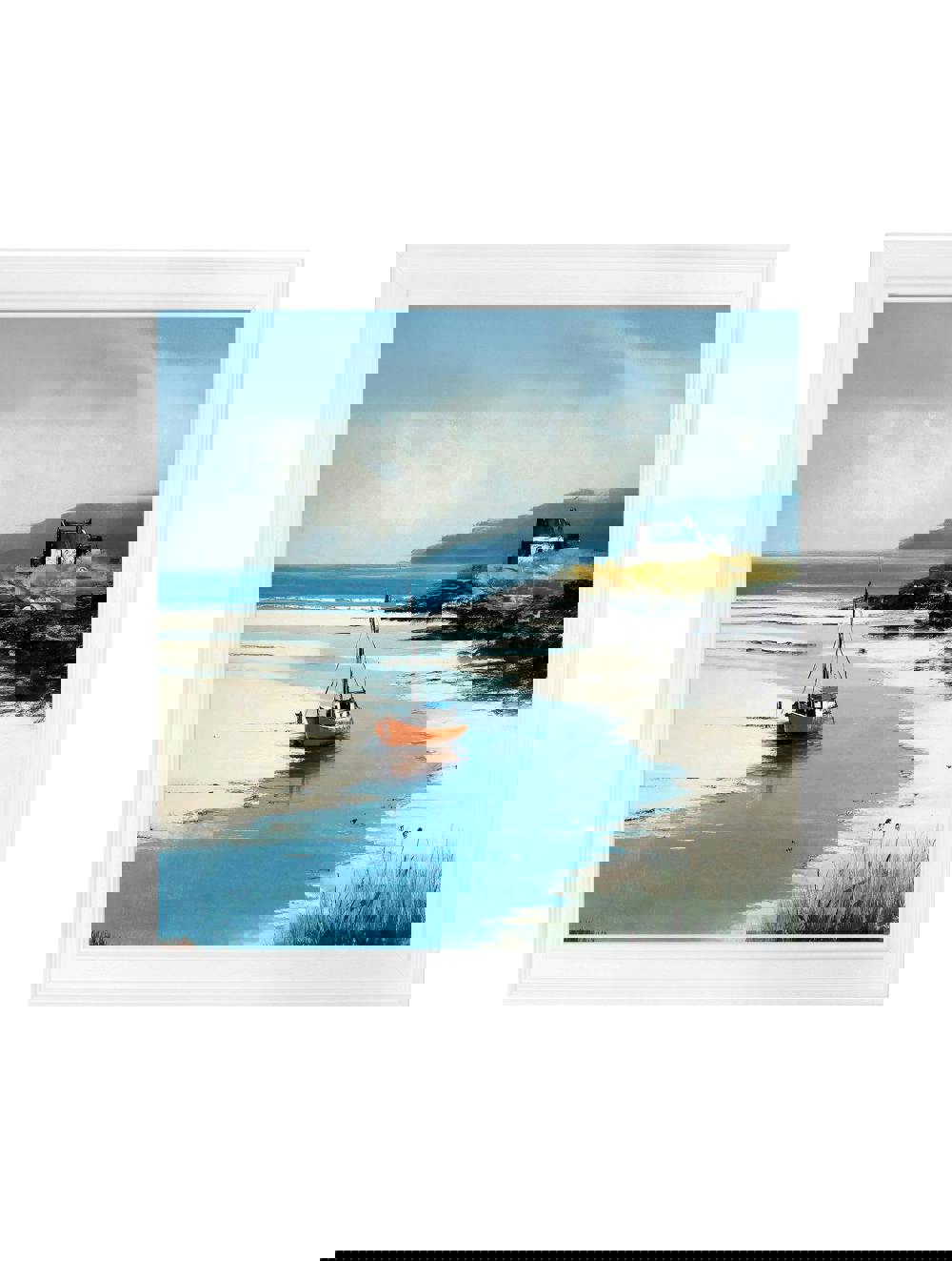 This tranquil coastal print captures a quiet moment where land, sea and sky meet in perfect harmony. A small fishing boat rests gently in shallow, glassy water, its warm terracotta tones stand out against soft sandy shores and cool ocean blues. In the distance, a white cottage sits peacefully on the grassy clifftop. Expressive brushstrokes bring movement to the sky and sea, creating a beautiful contrast with the soft sandy shore. A calming scene that instantly brings a breath of coastal tranquillity indoors. Set against a soft blue background and finished in our square Strong White Hurstwood frame, it pairs perfectly with our Coastal Collection.