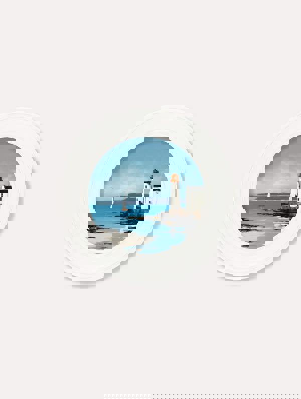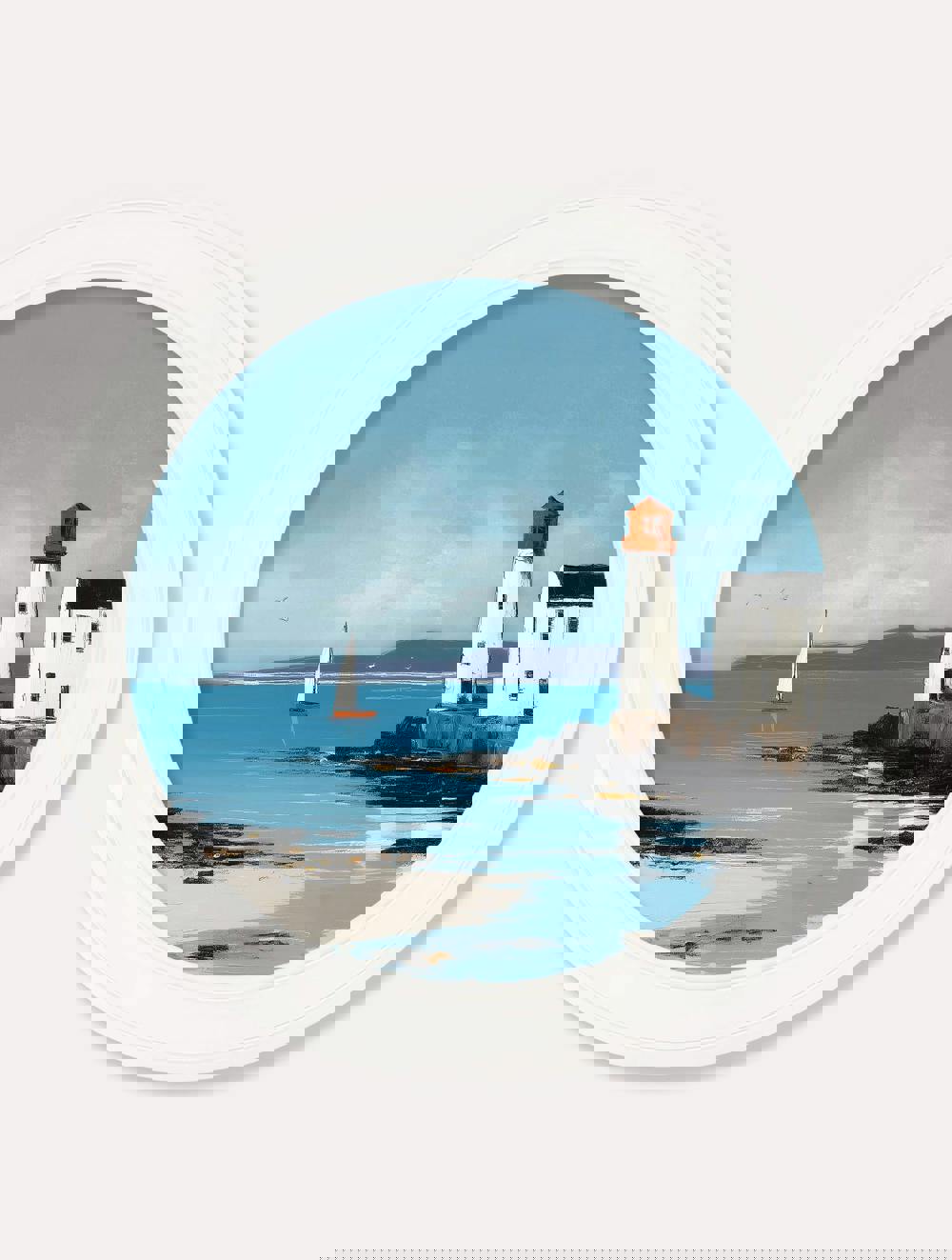 This peaceful coastal print captures the quiet beauty of open water and watchful shores. A tall white lighthouse stands proudly against a soft blue sky, its warm terracotta top adding a pop of colour beside the shoreline cottage. In the distance, a lone sailboat glides across calm waters, bringing a sense of freedom. Expressive brushstrokes bring movement to the sky and sea, creating a beautiful contrast with the soft sandy shore. A calming scene that instantly brings a breath of coastal tranquillity indoors. Set against a soothing blue background and finished in our round Oxford Strong White frame, it pairs perfectly with our Coastal Collection.