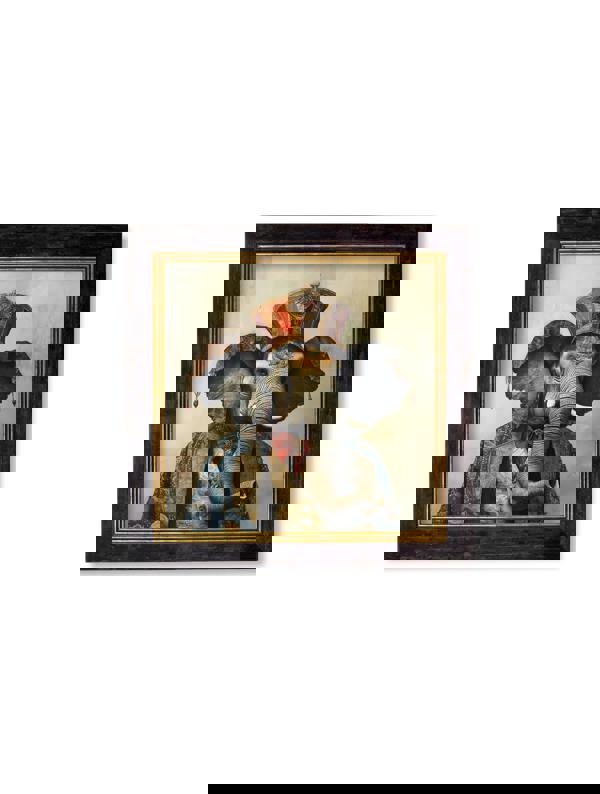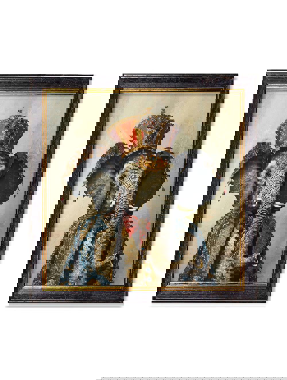 The Great Elephanto captures the character of a circus ringleader with a poised, elegant presence. Inspired by an 18th Century rider, this distinctive portrait is presented in an Oxford square frame in black and gold, designed to bring a confident focal point to your interior.