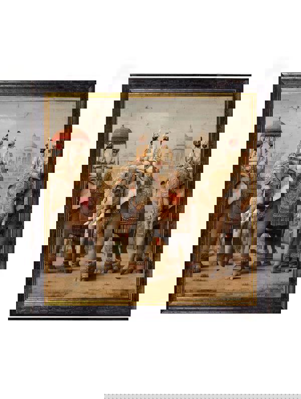 These striking prints feature majestic elephants carrying noble riders in a poised, ceremonial procession. The intricate detailing and rich decorative textures highlight the ornate textiles and regal attire, while the architectural backdrop adds depth and a sense of grandeur. The soft, muted tones create a sophisticated focal point full of heritage and imperial grace. Set against gentle, atmospheric hues and finished in our signature square Oxford Black and Gold frame. They are perfect as a standalone statement piece or paired with their companion print.