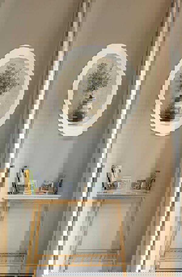 Finished in the brand’s signature round Oxford Black and Gold frame, the soothing palette of muted neutrals, soft sage and chalky stone creates a relaxed yet refined focal point for a variety of interiors.