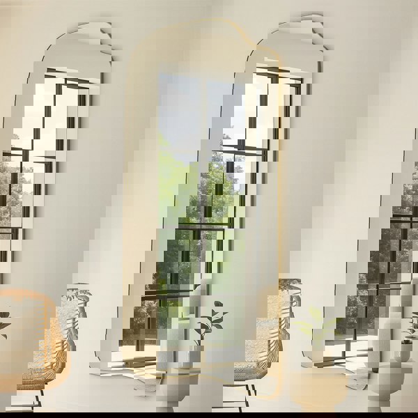 The Modern Gold Irregular Frame Leaner Mirror is a captivating and contemporary decorative piece that is sure to add a touch of sophistication and style to any room in your home. Measuring an impressive 170cm in height and 90cm in width, this full-length wall mirror is the perfect size for making a statement in any space.
