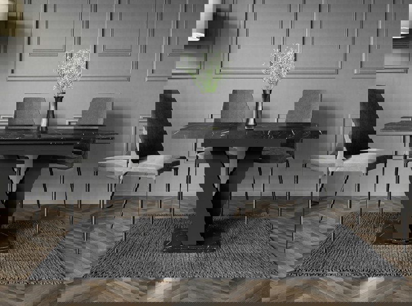 Want a space saving dining table that adds a touch of glamour? The MASIV extendable dining table combines a stunning Black Royal Marble effect top with a sleek black V-shaped base, creating a dramatic and luxurious dining room table design.