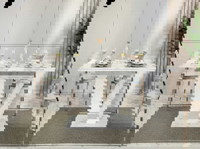 The DUBAI extendable dining table brings together timeless White Bianco Marble elegance and modern White Gloss sophistication. With its distinctive V-shaped base and extendable top (120–160 cm), it’s not just a table – it’s the statement centrepiece your dining space deserves.