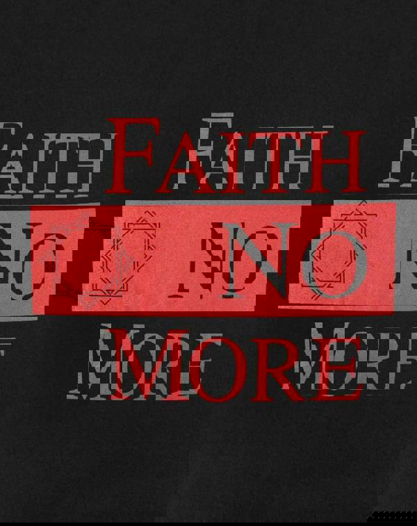 The design across the front of the t-shirt showcases the classic Faith No More logo along with bold text lettering in vivid red set against the classic black of the t-shirt