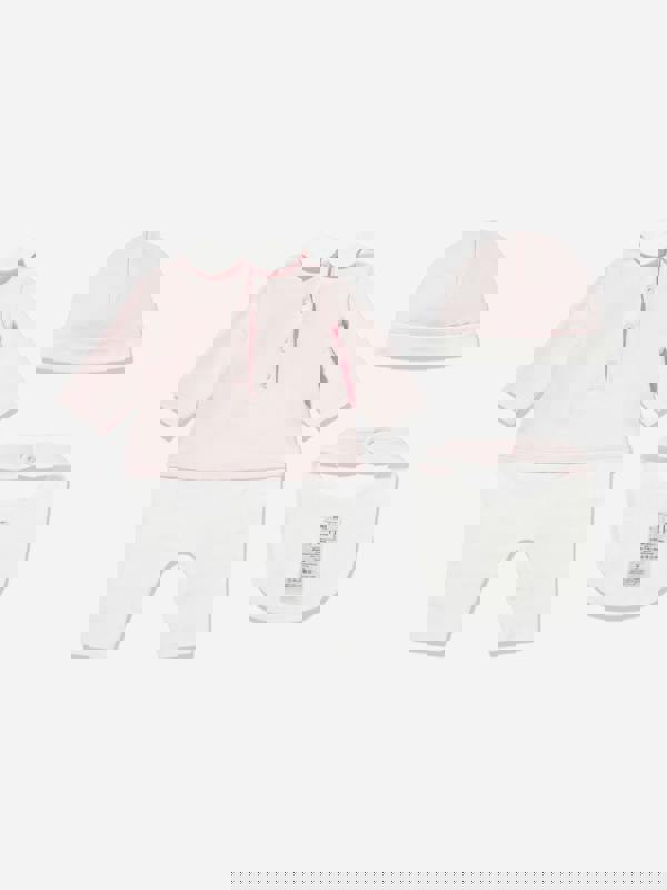 The set includes a matching hat and bib, creating a coordinated look. Made from a cotton-rich blend with added elastane, it offers a soft handle and gentle stretch.