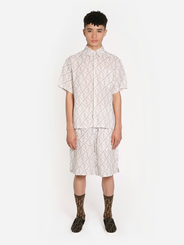 Crafted from linen, this pair brings a clean, premium finish to everyday outfits and holiday packing. The repeated FF motif adds a distinctive designer detail, while the simple short silhouette keeps the focus on the fabric and print.