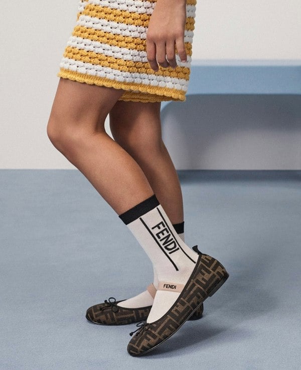 These Fendi Kids ballerina pumps combine a jacquard outer with an all-over tobacco FF logo detail. A round toe and dainty bow at the front keep the silhouette classic, while nude-colour elastic straps wrap around the insteps for a secure finish. The inside is made from goat leather, with the pair produced in Italy.