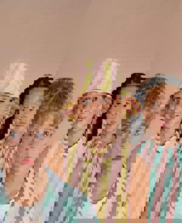 Fendi Kids girls bucket hat in yellow with the Pequin print. Made in Italy, this piece forms part of the SS2025 collection and brings a recognisable Fendi motif to a classic bucket hat shape.