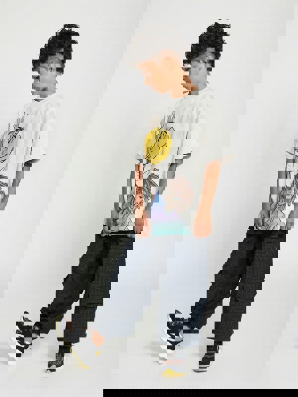 These boys’ navy blue cargo trousers combine a utilitarian silhouette with Fendi’s signature FF motif. Dark cotton jacquard creates an all-over, tone-on-tone FF logo pattern, finished with Fendi Roma embroidery for a branded detail. Made in Italy, the pair is constructed in 100% cotton, with embroidery in 100% polyester.