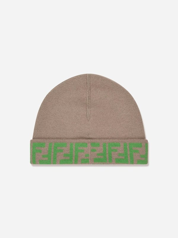Fendi Kids FF Logo reversible beanie in beige. Made in Italy, this unisex beanie has a reversible design and an all-over FF logo print.