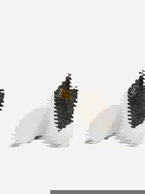 These Fendi Kids trainers combine jacquard fabric uppers with an all-over tobacco FF logo. Yellow Fendi Roma embroidery adds a branded finish, while the white rubber sole and matching white rubber toe complete the look. Made in Italy, they are finished with a cotton lining and calf leather on the inside.