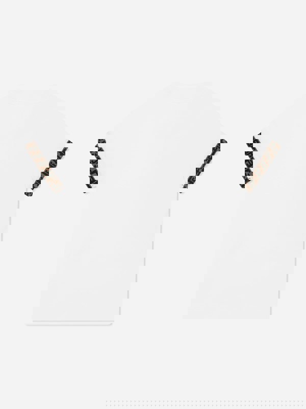 Fendi Kids Logo Trim T-Shirt in white with short sleeves and a jersey finish. Tobacco FF logo ribbons run along the sleeves, adding a branded trim detail. Made in Italy.