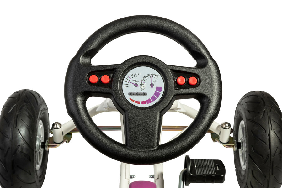 Made in Germany, this sturdy large go kart has a robust, high quality white steel frame. It features an automatic freewheel system with all terrain pneumatic tyres, for a perfect fun driving experience. It also has an ergonomic, adjustable racing style seat, a multisound steering wheel with thumb recesses, requires 3 x AAA batteries, not supplied, a large robust plastic white fairing and a handbrake. Maximum rider weight 50 kg. Suits ages 3 to 8 years. Dimensions of Item: 102 x 60 x 64 cm.