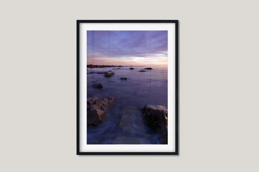 Elevate your interior design with this mesmerising seascape art print, showcasing a tranquil coastal scene bathed in the soft hues of twilight. The image captures the serene beauty of the ocean, with gentle waves lapping against rocky shores under a sky painted in shades of purple, pink, and blue. This captivating piece invites a sense of calm and introspection, making it a perfect addition to any room.