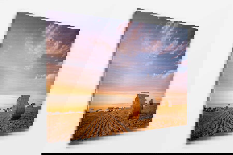 Step into the serene embrace of the countryside with Bales at Sunset, a landscape wall print that captures the golden hour in all its tranquil glory. As the sun dips below the horizon, its warm glow bathes the fields and hay bales in a soft, radiant light, inviting a moment of stillness and reflection. This artwork serves as a daily reminder of the simple beauty found in nature's quiet moments, making it the perfect addition to any space that seeks to inspire peace and harmony.