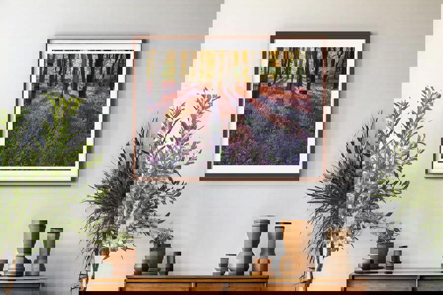 Display your bluebell landscape print away from prolonged direct sunlight, high moisture and strong heat, and dust lightly with a soft, dry cloth to preserve the spring tones.
