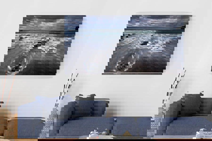 A unique seascape photograph showing waves crashing over black volcanic origin beach sand, balanced with a very dramatic sky at Amora Beach, Miguel Island, Azores near Portugal. Available as a panoramic canvas – please contact us for bespoke sizing options. Panoramic seascape canvases enhance a room's interior design by providing a stunning focal point that brings a sense of tranquility and openness, mimicking the vastness of the ocean. The expansive view and soothing colours of the seascape create an illusion of more space, making the room feel larger and more dramatic.