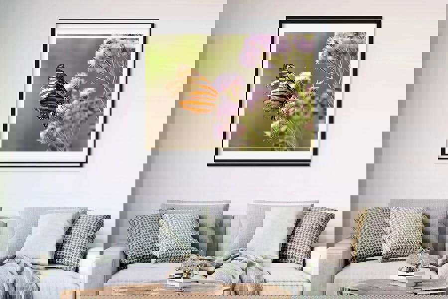 Perfect as bedroom wall art, a living-room print, or a bright accent in a study or hallway, this striking butterfly photograph complements contemporary neutrals, botanical schemes and eclectic interiors alike – delivering a bold focal point loved by homeowners and interior designers.