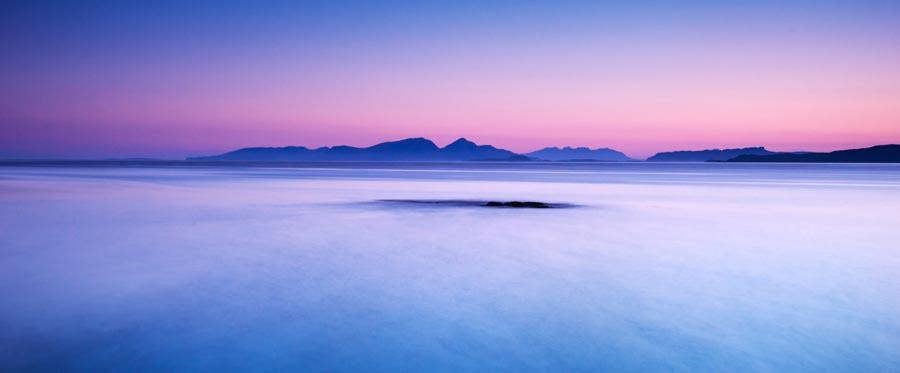 With this panoramic canvas wall print you get the pink light of dawn in all its glory as it fills the sky behind the islands of Rhum, Eigg and Skye. The purples and blues blend to make a soft, soothing image that will bring an element of peace to any room it hangs in. A long exposure has created the soft, smooth water surface of this expansive coastal seascape from the Western Isles of Scotland.