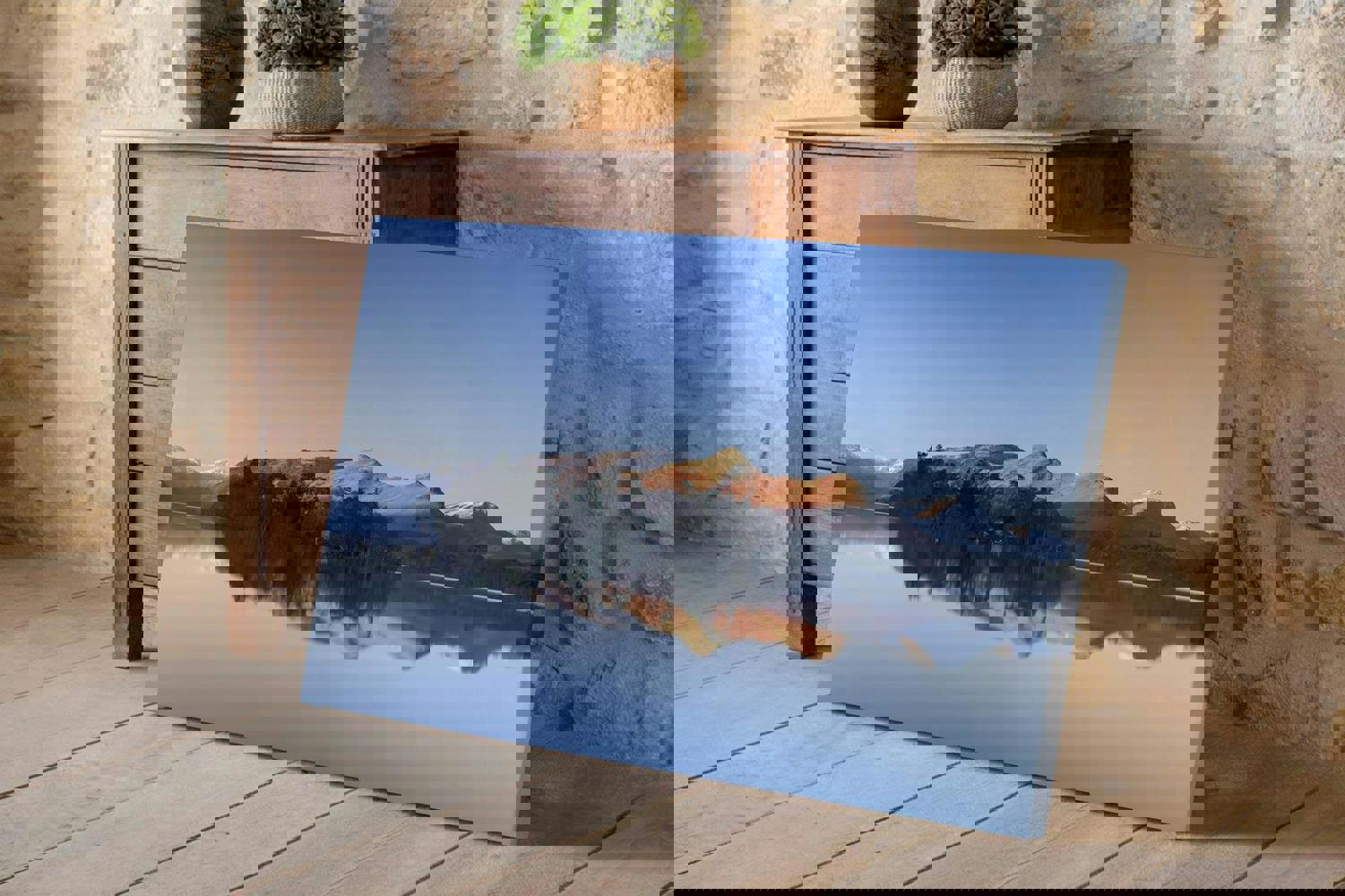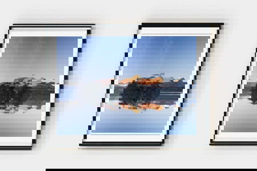This fine art landscape picture is well suited to interiors that benefit from visual balance and horizontal structure. It works effectively in living rooms, bedrooms, hallways or offices where wider wall spaces allow the full reflection to be appreciated. The combination of warm light and cool tones enables it to sit comfortably within neutral interiors, alongside wood finishes, soft textiles or more contemporary settings with clean lines.