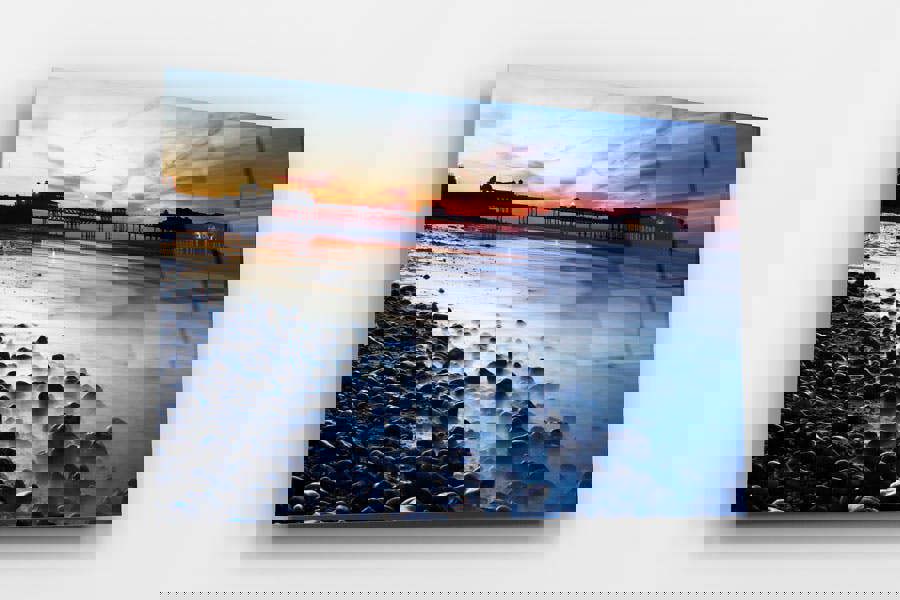 This seascape art print shows Cromer Pier at dusk with beautiful colours stretching across the sky as the sunset fades behind the horizon. Cromer is a seaside town in Norfolk and situated on a cliff-top overlooking fine sandy beaches. There has been a pier or jetty in Cromer since 1391.