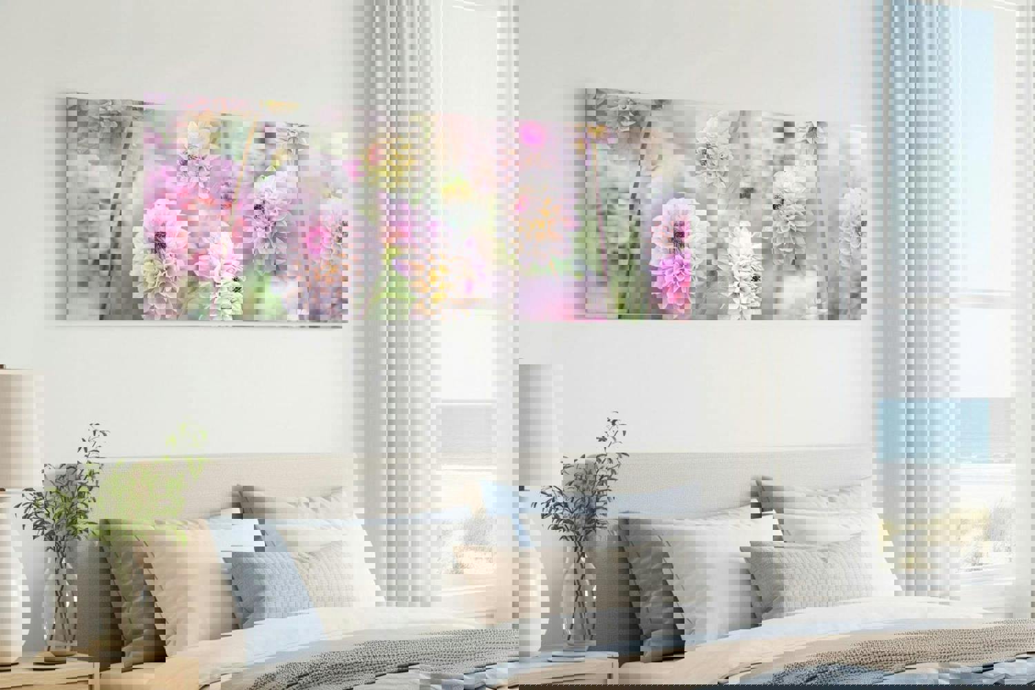 This flower canvas works beautifully in spaces where you want a light, refined touch – bedrooms, living rooms, hallways and even home offices. Its gentle palette makes it easy to pair with neutral décor, Scandinavian themes, soft minimalism or more romantic interiors. Because the flowers fill the frame from edge to edge, it becomes a statement wall piece without feeling overpowering, offering a fresh and soothing note to any room that needs a lift.