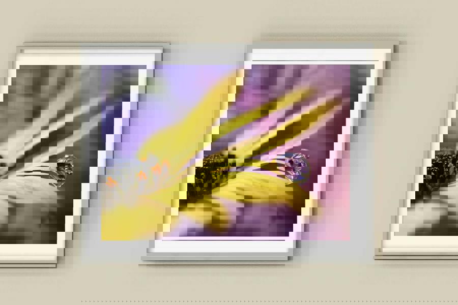 Photographed by Lynette Evans, this macro fine art print celebrates the magic found in the smallest details. The vibrant yellow petals contrast beautifully with the soft purples in the background, while the crystal-clear droplet acts like a miniature lens, revealing a hidden bloom inside. It’s a photograph that makes you appreciate the delicate beauty of Mother nature - a theme we have with all our pictures at Fotoviva.