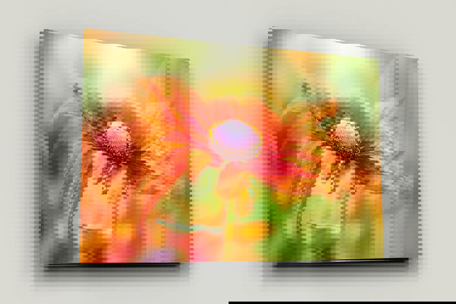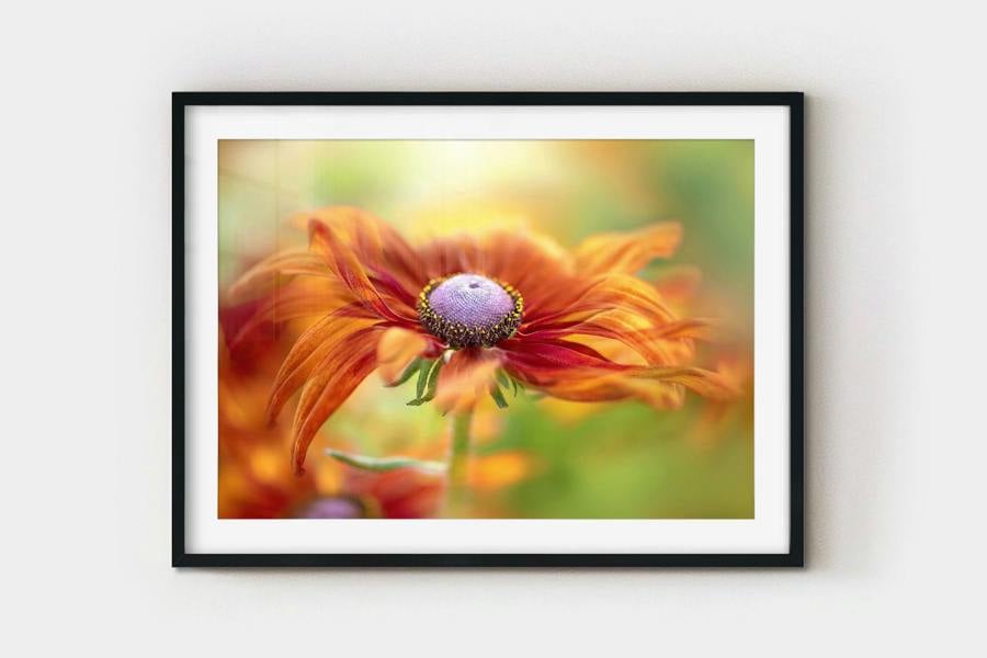 This close-focus botanical print captures the distinctive structure and movement of rudbeckia petals through a refined photographic approach. With its layered colour and softened detail, the image presents a contemporary interpretation of floral wall art, suited to interiors that favour subtle texture and considered composition.