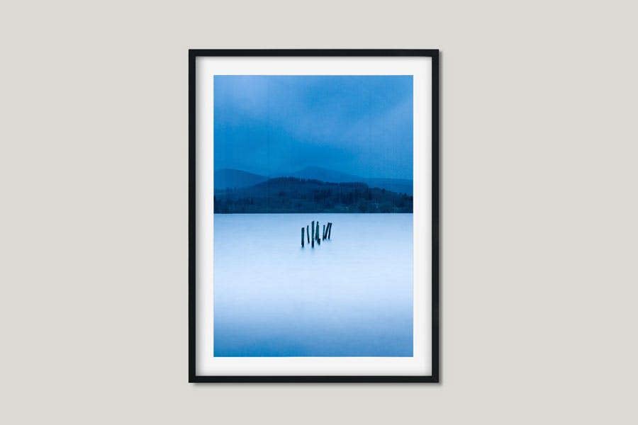 This relaxing fine art print shows Derwent Water in the Lake District, Cumbria in an early morning scene. A tranquil almost dream-like atmosphere is created by the still waters and the old wooden pier remains.