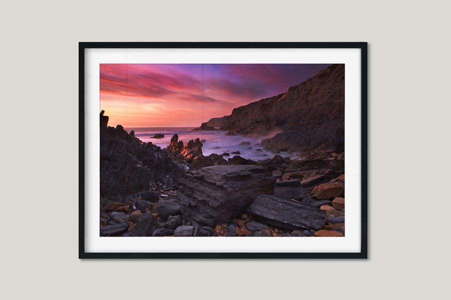 Experience the raw beauty of Portugal’s Sintra Natural Park with this breathtaking sunset seascape. Capturing the warm glow of the fading sun over a wild, rocky shoreline, this beach print evokes a sense of tranquility and wonder. The rich, golden hues blending into soft purples and blues create a mesmerising contrast against the rugged coastal terrain, making this piece a striking focal point in any space.