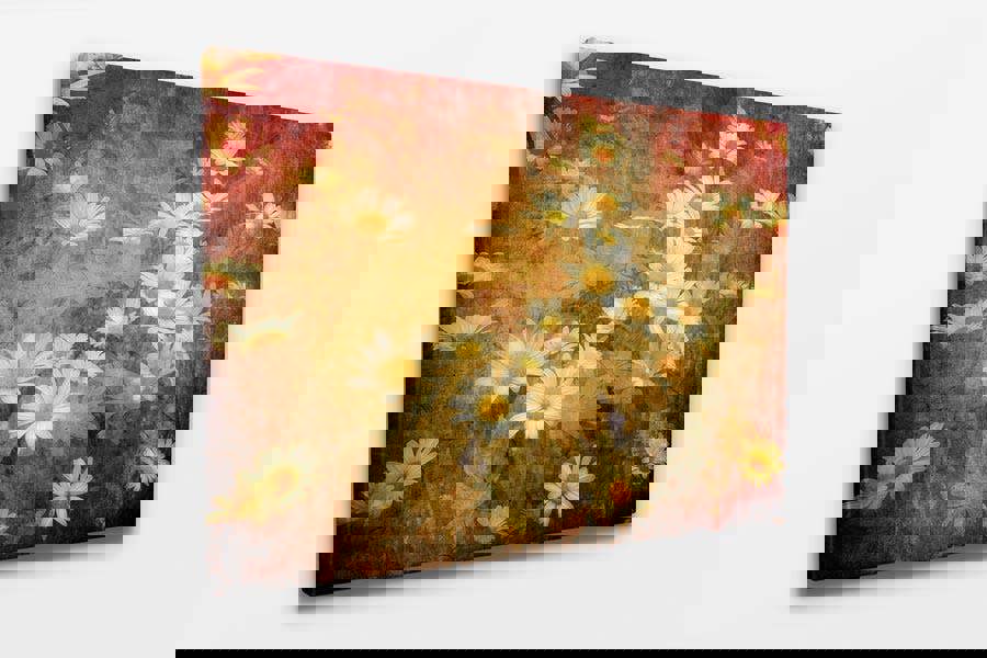 This enchanting daisy artwork beautifully captures the essence of a dreamy, nostalgic garden filled with delicate white daisies. The image features a cluster of daisy blooms, their bright yellow centers and white petals standing out against a richly textured background of warm earthy tones. The layered effect creates an ethereal, almost painterly quality, evoking a sense of timeless beauty and serenity.